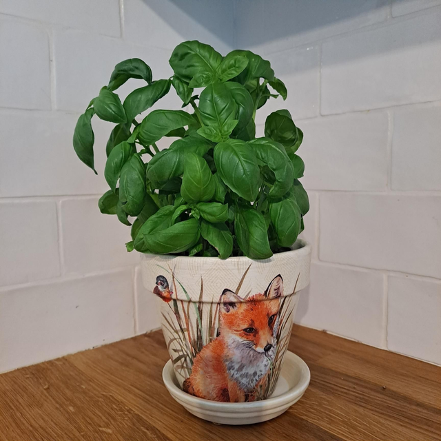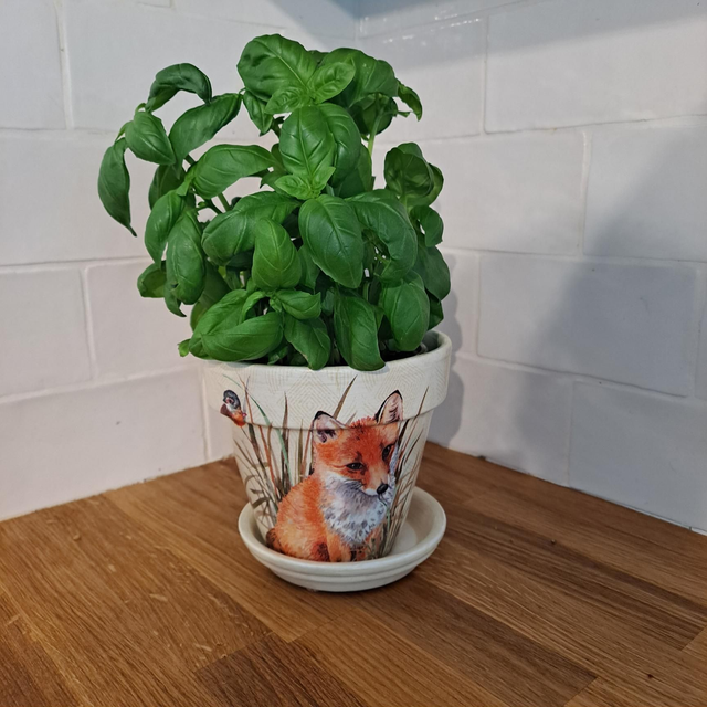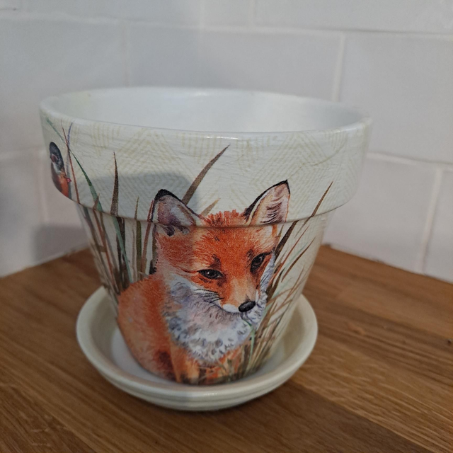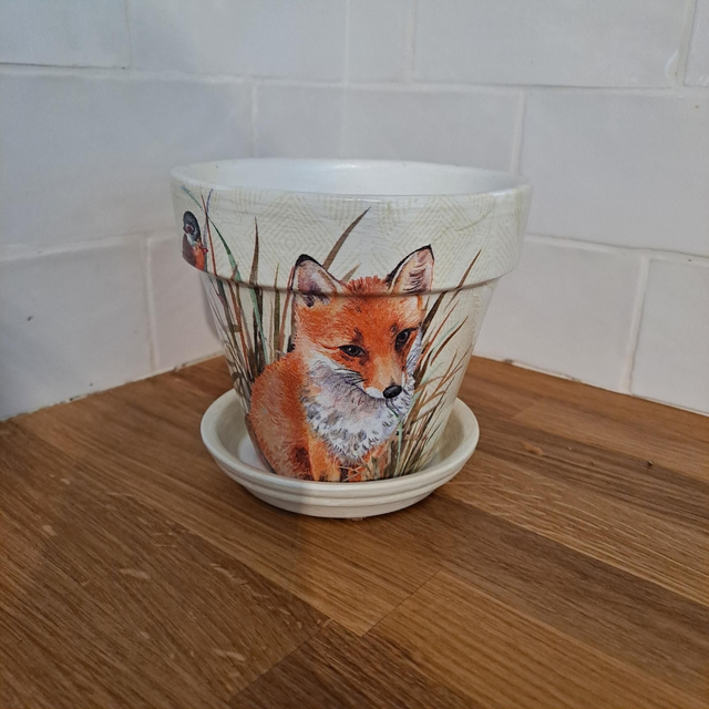 Terracotta plant pot which has been decoupaged on all sides. The pot has been painted white inside and out before been hand decorated. Each design has been coated in 4 layers of hard wearing varnish.