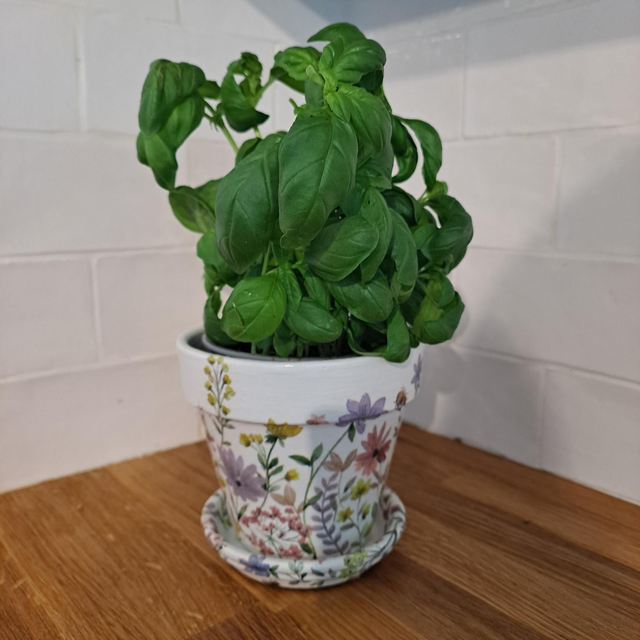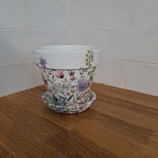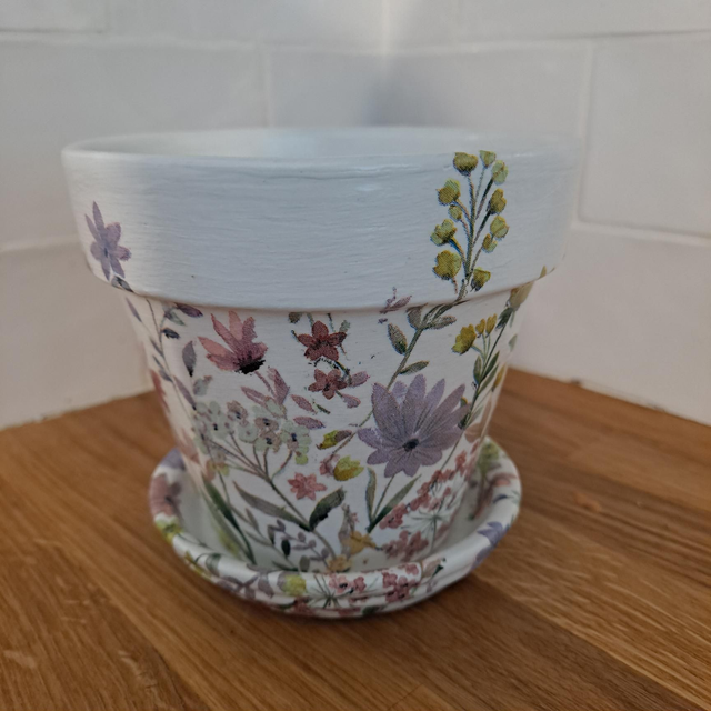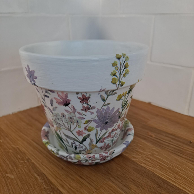 Terracotta plant pot which has been decoupaged on all sides. The pot has been painted white inside and out before been hand decorated. Each design has been coated in 4 layers of hard wearing varnish.